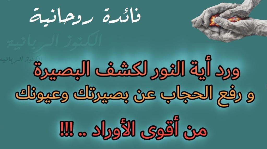 السلام عليكم و رحمة الله كنز رباني من الكنوز المخفية اقدمه لكم اليوم و هو كيفية الورد باية النور لكشف البصيرة و رفع الحجاب عن عيونك و الكشف النوراني الصحيح و اعلم ان الورد باية النور هو أصلا مفتاح الكشف و فتح بصيرة القلب فكيفيته جهز أولا ماء مقروء عليه الاية المباركة عدد 19 مرة لكي تمسح به كل صباح على جبهتك و عينيك و المسح بهذا الماء يكون لمدة سبع ايام و تابع على قراءة الاية المباركة بنية كشف بصيرتك و رفع الحجاب عن عيونك بعد كل صلاة مفروضة و القراءة عدد 11 مرة لمدة 7 ايام و عند الانتهاء من قراءة الاية المباركة تضع يدك اليمني على جبينك و تقول السلام عليكم أيها الملكان الموكلان بيميني و شمالي ارفعوا الحجاب بيني و بينكم حتى اراكم بعيني و اكلمك بلساني و اسألكم عن حاجتي فلا اقسم بمواقع النجوم و انه لقسم لو تعلمون عظيم .. فانك ان قمت بها كما ذكرت لك سترى عجبا شديدا و تندهش من سرعة التواصل بينك و بين ما تريد باذن تعالى فافهم قولي و اعلم ان الفائدة من الصدور و ليس السطور .. احبابي في الله لكي لا اطيل عليكم تقبلوا فائق محبتي و السلام عليكم و رحمة الله